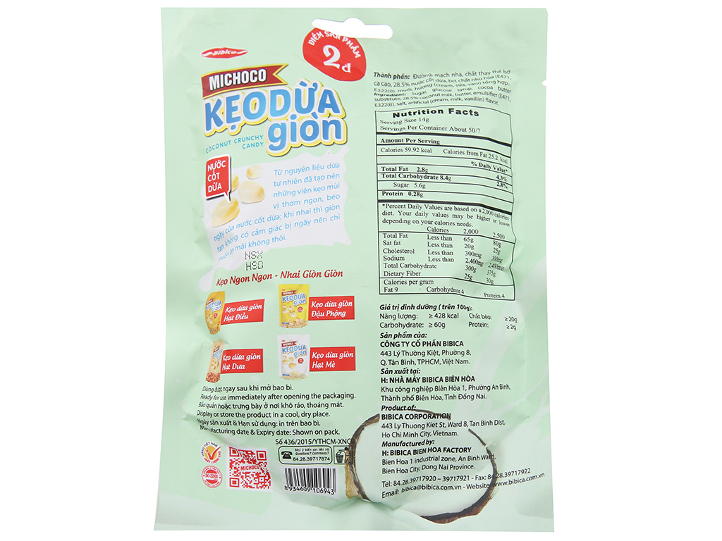 Michoco Bibica 100g crispy coconut candy is produced by advanced technology, does not contain toxic chemicals. The product has a rich aromatic coconut milk flavor that feels interesting to you to use. Michoco Bibica crispy coconut candies are made from natural coconut materials that create the delicious, greasy candies of coconut milk. When chewing candy is crispy, there is no feeling of being sick, so it is interesting to enjoy. Produced from sugar, malt, coconut milk, butter ... do not use colorants to create toxic scents should be absolutely safe for health. The product is packed compact, very convenient for use and storage in the home or to carry when traveling, picnicking ...