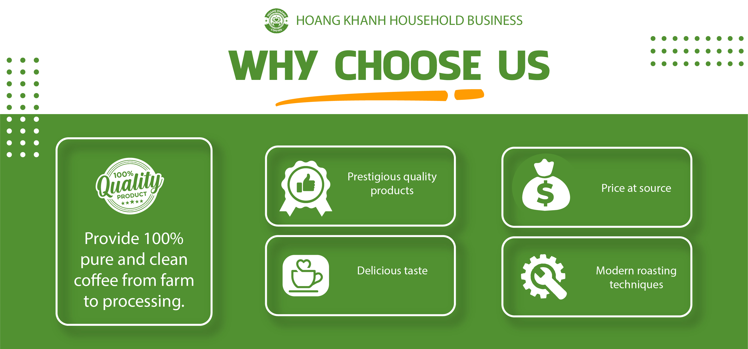 Strong and flavorful coffee is the core factor to attract and retain customers, the key to the success of opening a cafe. Understanding that, Hoang Khanh Coffee has meticulously researched to create 3 lines of pure filter coffee with a strong bitter taste, a strong aroma that is suitable for the taste of traditional customers. Besides, to meet the needs of modern coffee shops, Hoang Khanh Coffee provides quality Robusta, Arabica and Blend roasted coffee beans, suitable for machine brewing. Please contact us for the best price.