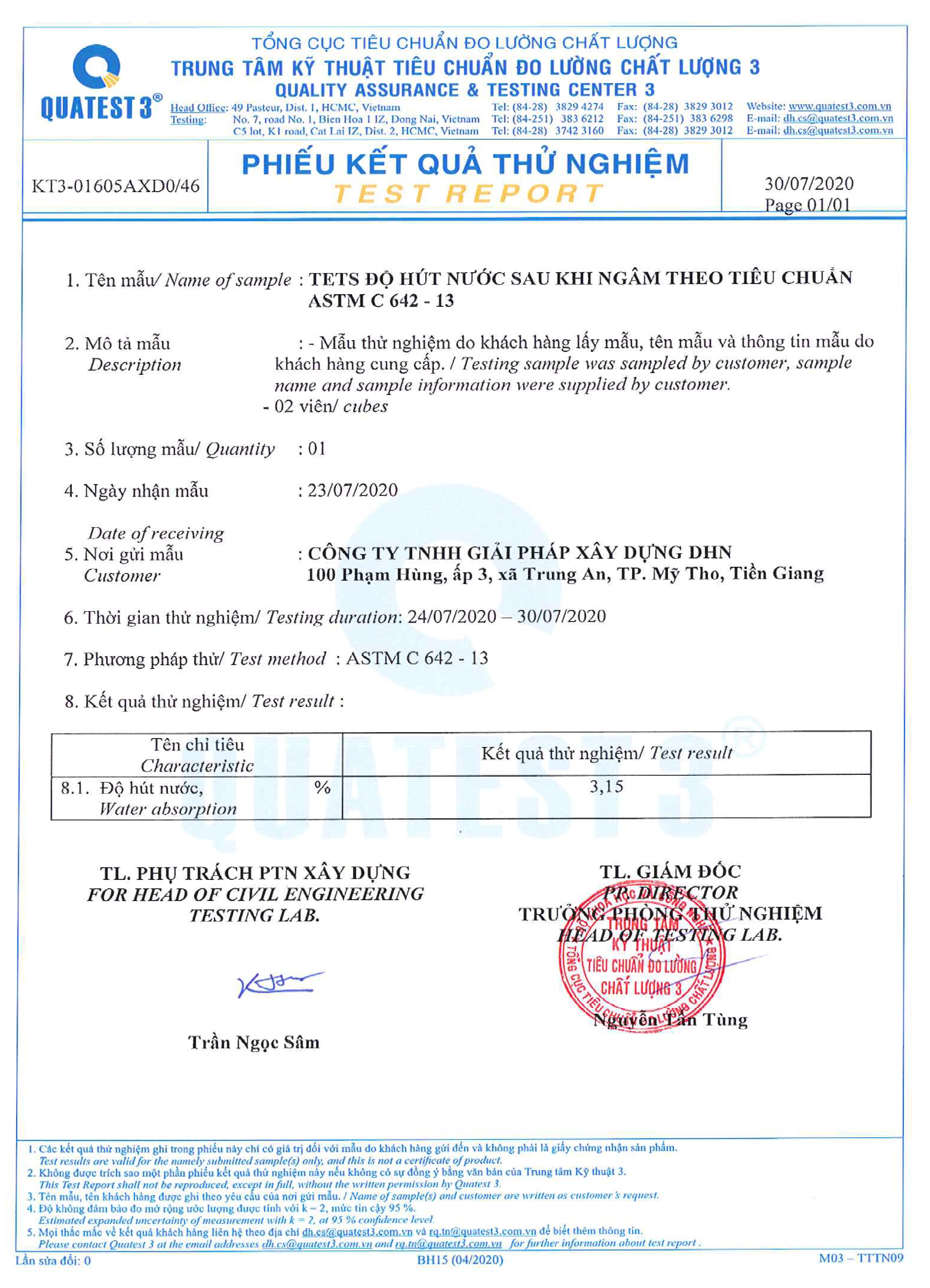 - Water absorption result: 3.15%